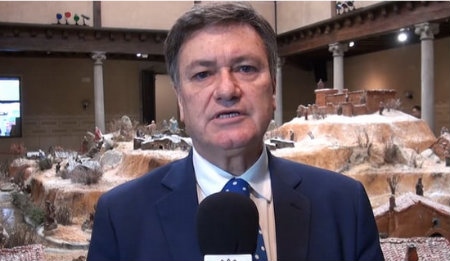 El presidente da las gracias por su trabajo a los empleados de la Diputación y a todos los miembros de la corporación provincial en una toma grabada junto al Belén en el patio del palacio provincial.