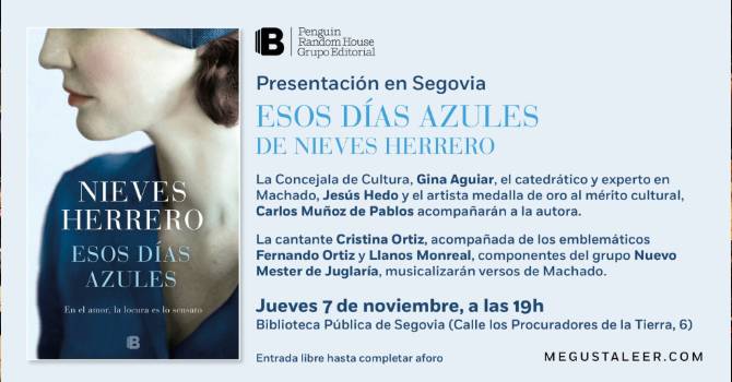 En el marco del Centenario de la llegada de Machado a Segovia completando la Muestra Biblioteca Oculta sobre los tesoros bibliográficos del autor que normalmente no están visibles para el público, se presentará en la Biblioteca la novela de Nieves Herrero ‘Esos días azules’.