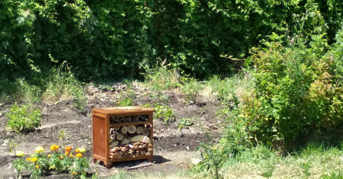 Los pequeños hortelanos, incorporaron al hotel astillas de madera, tocones de madera agujereados y rollos de cartón para configurar las diferentes habitaciones; la idea es ofrecer distintos tamaños de orificios para que los insectos puedan utilizarlo como refugio diario y de cría.